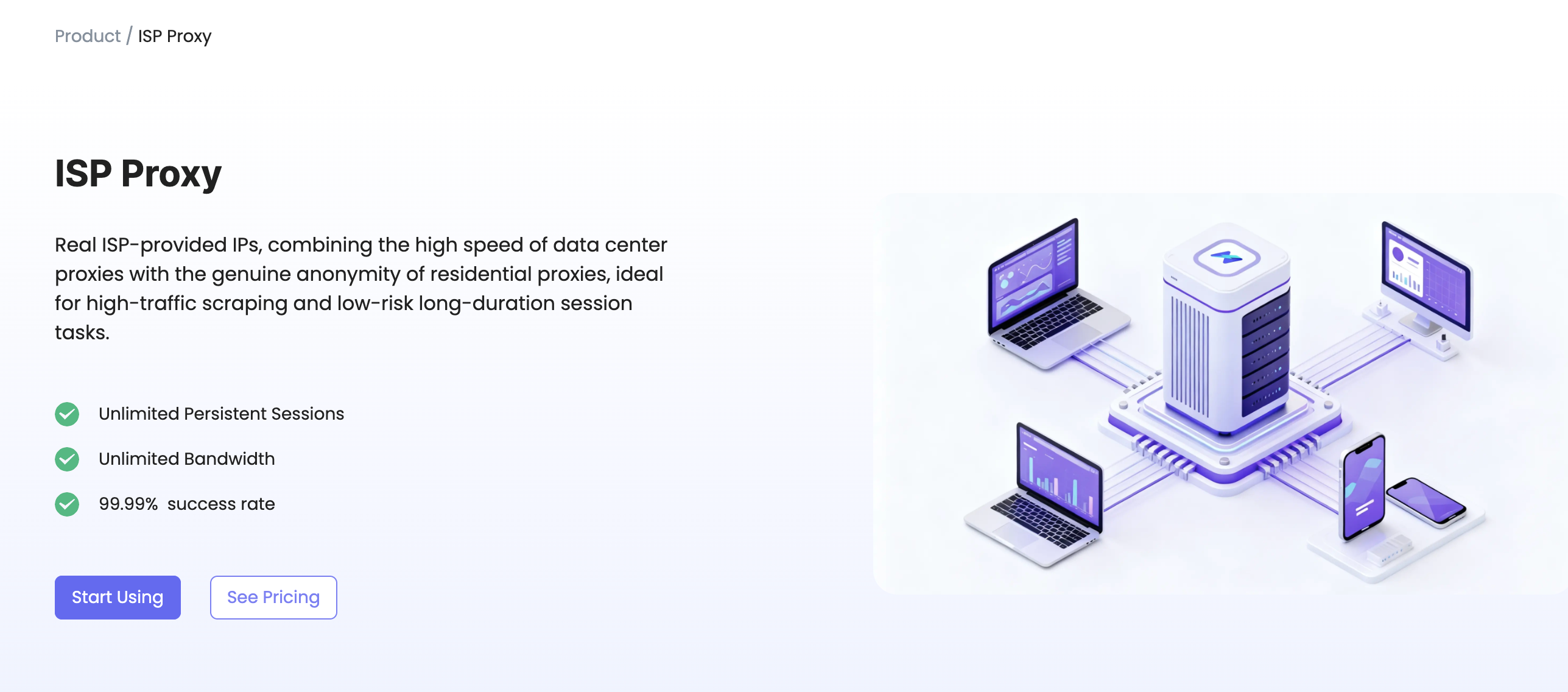 ISP Proxy are IP addresses registered as residential but hosted on a server in a datacenter. They offer a blend of speed and legitimacy.