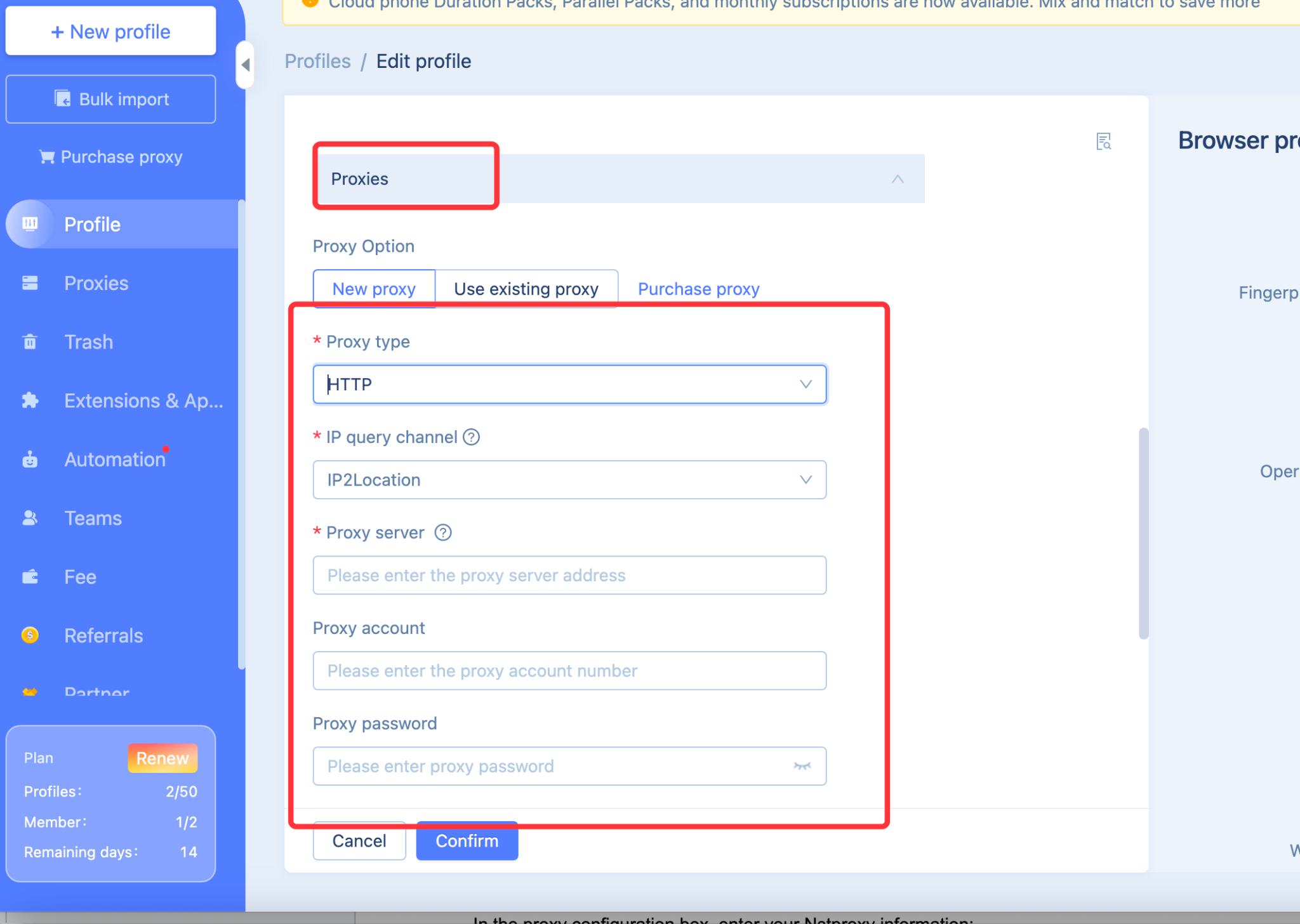 Selecciona HTTP o SOCKS5 dependiendo de tu tipo de proxy, luego ingresa:
