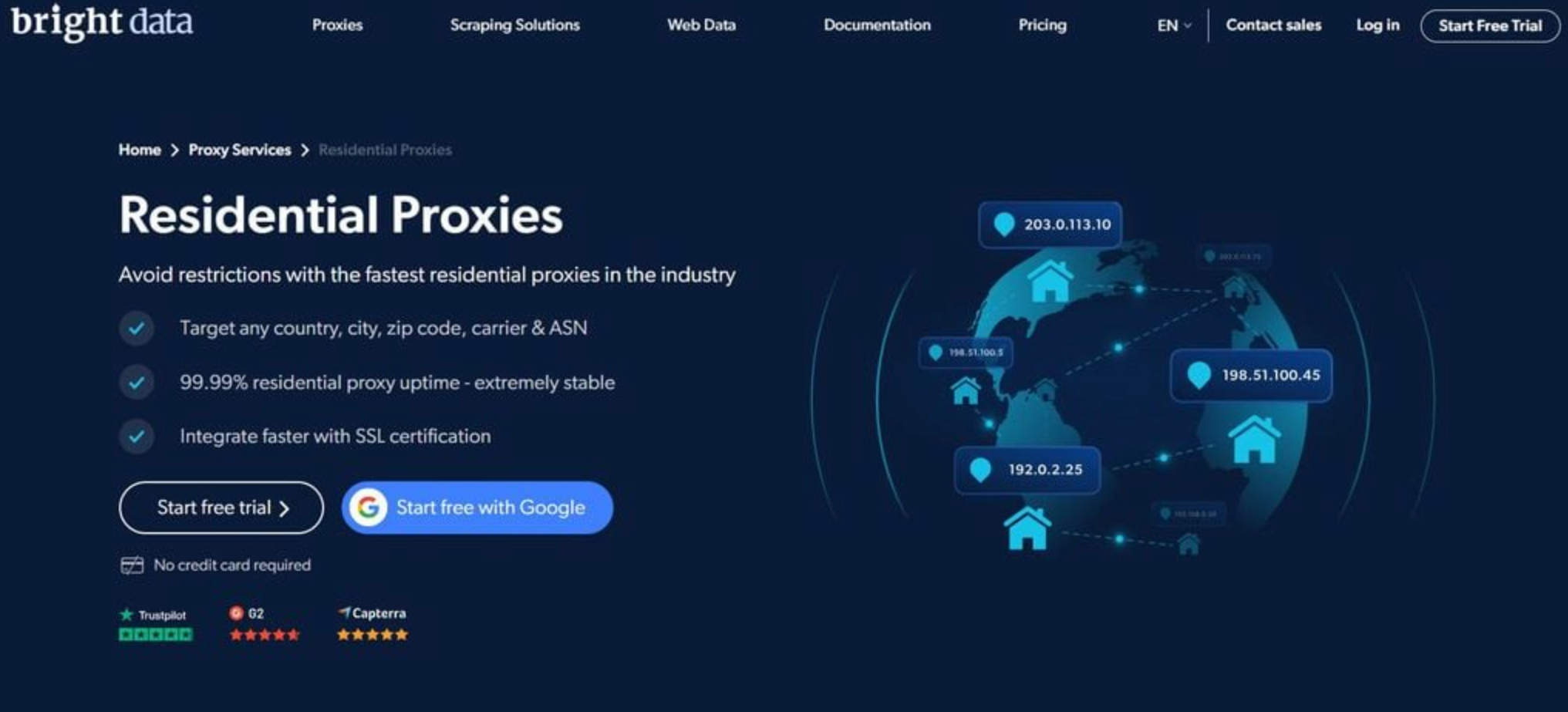 Bright Data(前称 Luminati)被认为是代理行业的领导者,拥有市场上最大和最复杂的IP网络。他们提供四种主要的代理类型:住宅代理、数据中心代理、ISP代理和移动代理。Bright Data 的优势在于其无与伦比的IP规模和先进功能,如代理管理器和网页解锁器。然而,其定价也相对较高,更适合预算充足的大型企业。