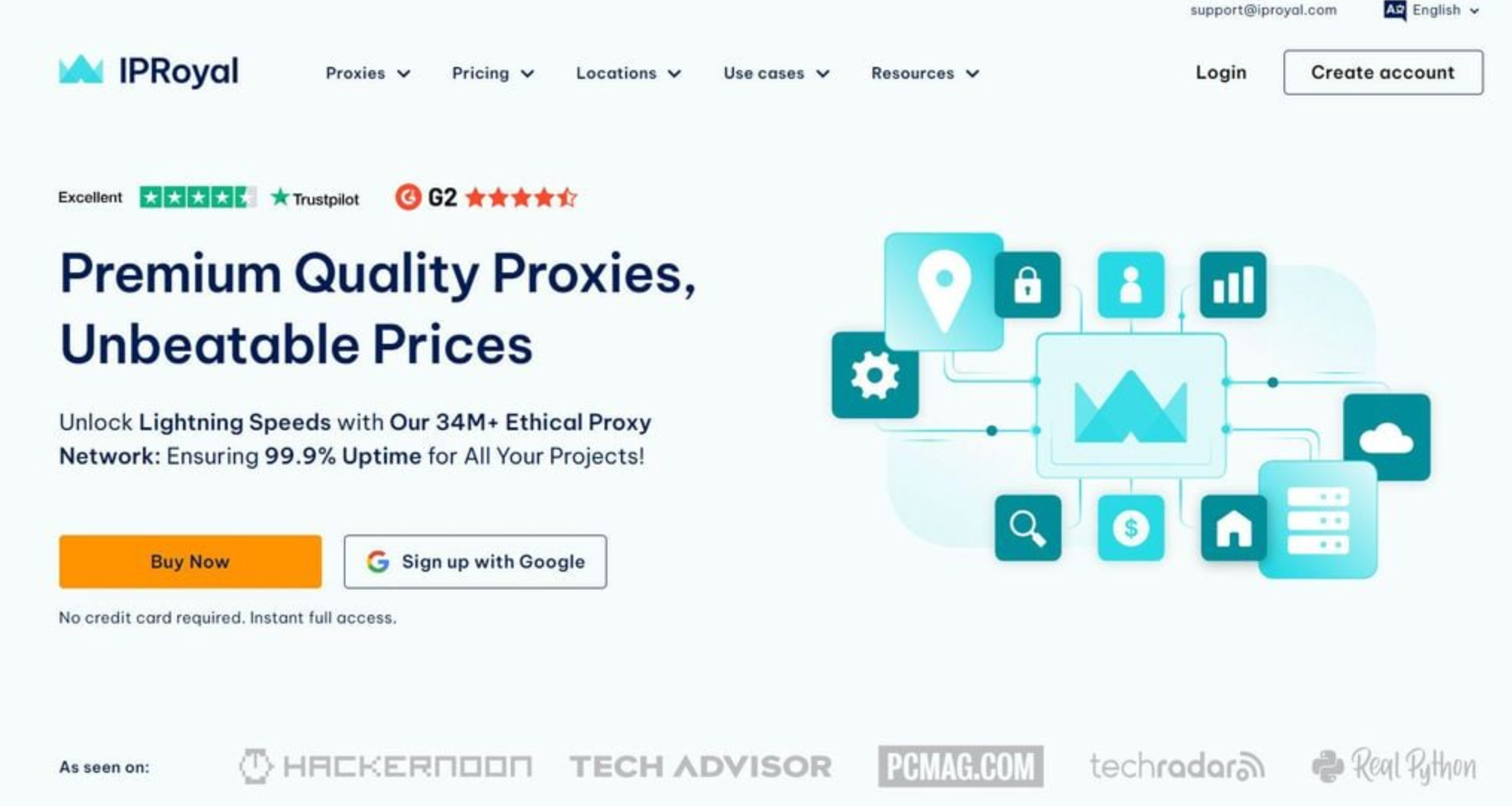 IPRoyal 提供多种代理服务,包括住宅、数据中心和运动鞋代理。他们的住宅代理因其“粘性会话”功能而受到用户青睐,这在需要对多个请求使用相同 IP 的场景中非常有用。IPRoyal 的定价模式相对灵活,提供按需付费和按月套餐,成为小型到中型项目可行的选择。